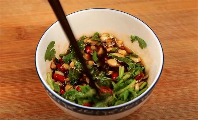 3.接著切點蒜末裝碗里,再準備3個小米辣切成圈,最后切點香菜,切好之后都放入碗中,往碗里加一點生抽,再加點陳醋,加入適量的食鹽和白糖,再加點香油,用筷子攪拌均勻。