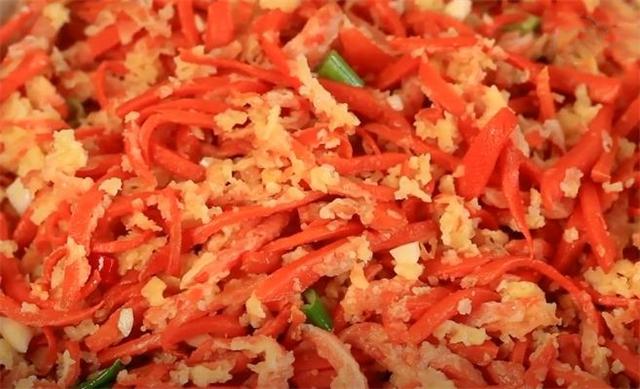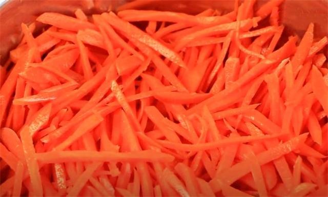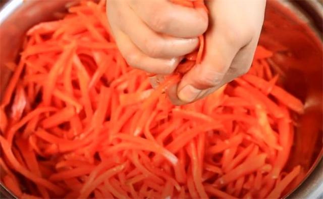 1.先把胡蘿卜切成薄片,然后再切成胡蘿卜絲,切好后都放入盆中,撒點食鹽,然后用手抓勻,抓勻后腌一個小時,把里面的水分腌出來。