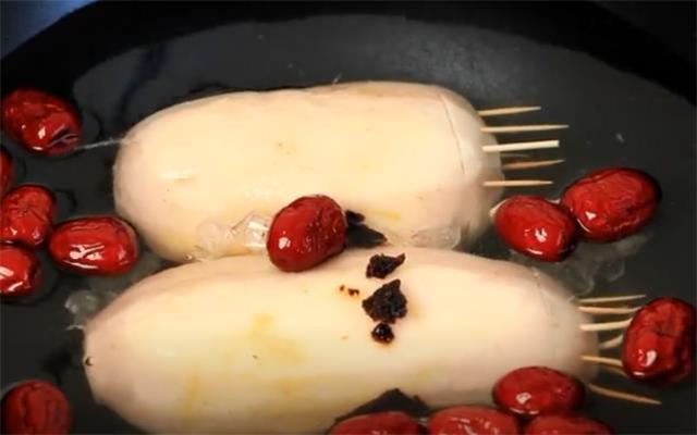 5.放到鍋里加入適量的清水,根據個人口味加點紅糖,再放幾粒冰糖,放幾顆紅棗,蓋上蓋子小火慢燉一個小時。