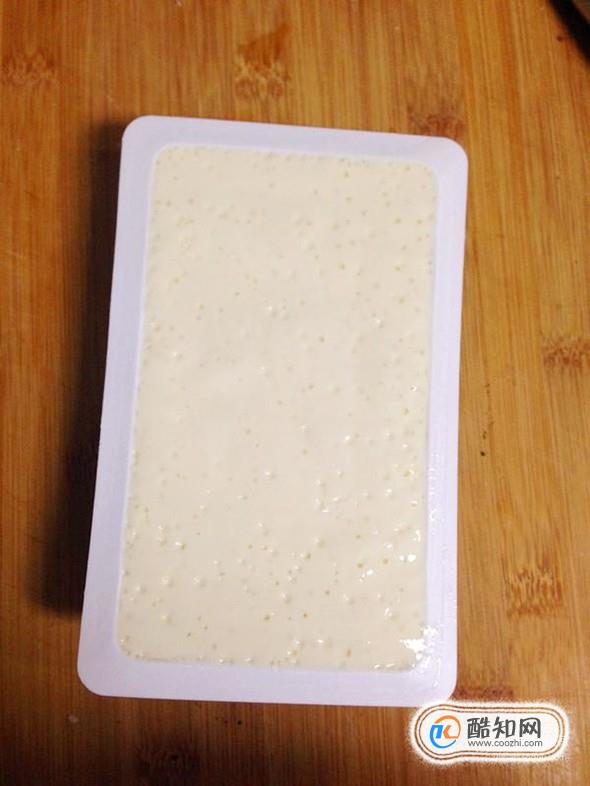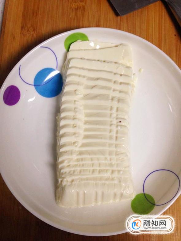 剪開盒子的四角,把豆腐小心地倒在盤中,并切成薄片。