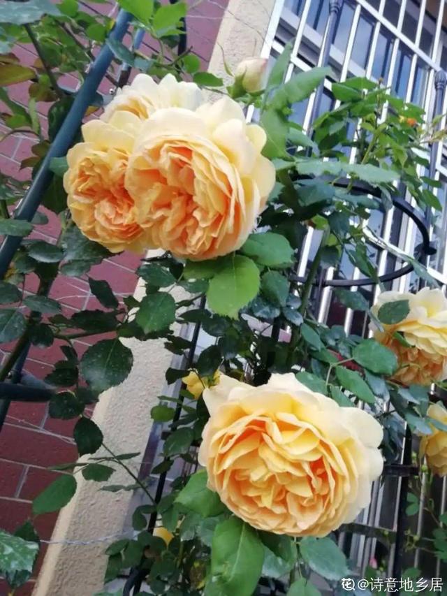 歡笑格魯吉亞 黃色系月季里特別愛爬藤的品種,它花朵很大,花量也很多,但是枝條又比較軟,所以大家一定要及時給它搭花架或者讓它沿著墻根攀爬,不然開花的時候很容易造成垂頭現象。