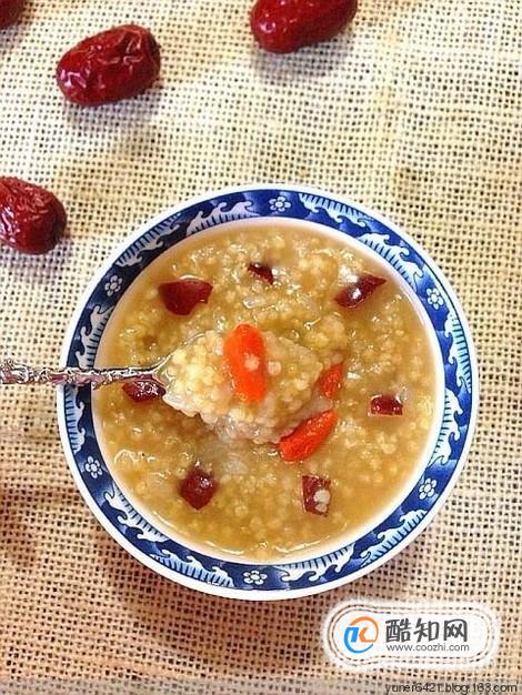 小米,紅棗,枸杞,紅糖,首先,把小米淘干凈,紅棗,枸杞洗干凈,等小米熬開后再加上紅棗枸杞,放進(jìn)去熬,由大火轉(zhuǎn)為小過,大概熬十幾分鐘出鍋時加入紅糖即可,有營養(yǎng)補(bǔ)血功效。 -