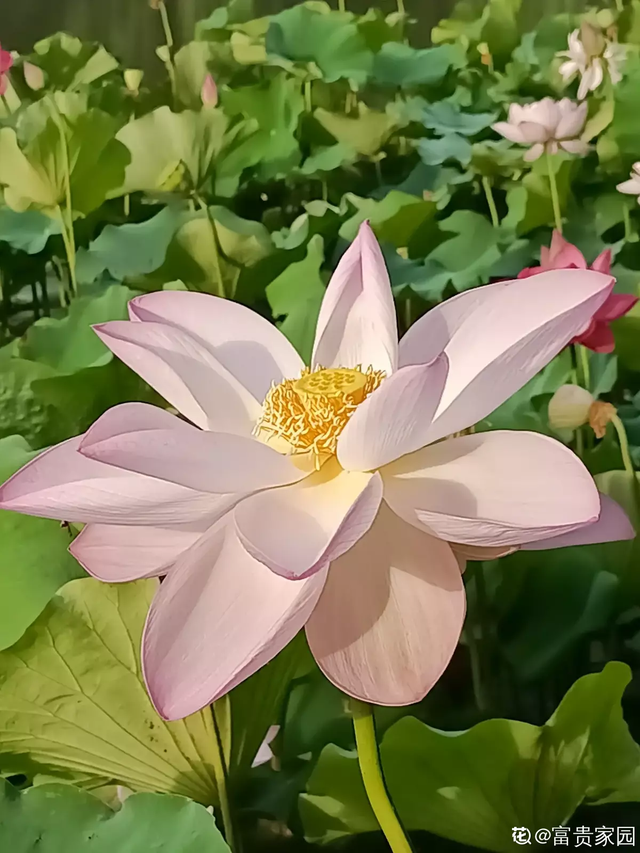 三、荷花 荷花的花期在6~9月,在我國有著悠久的栽培歷史,花花每次在想到荷花的時候,總能想到乘著一葉泛舟在荷塘采摘的樣子,出水芙蓉說的就是它。荷花的顏色大部分分為白色和粉色兩種,在8月的花苞一般格外大,納涼感十足。