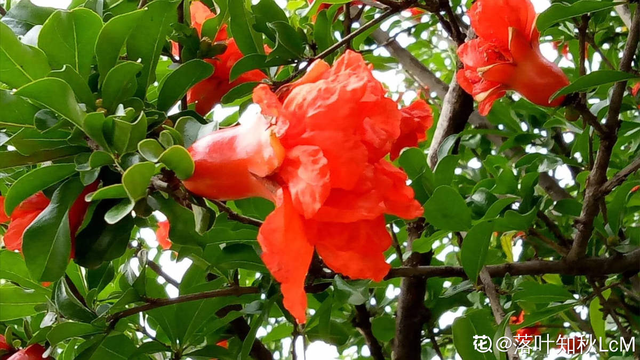 三、石榴樹 石榴樹的花和果實都是紅彤彤的,開的花和結的果子量又多,整個樹上掛滿紅紅火火的顏色,非常喜慶。并且石榴的果實里面有非常多的籽,也有著多子多福的寓意,以前的時候,如果哪個大家族希望自己的家族能兒孫滿堂,就會在門前種一棵石榴樹。