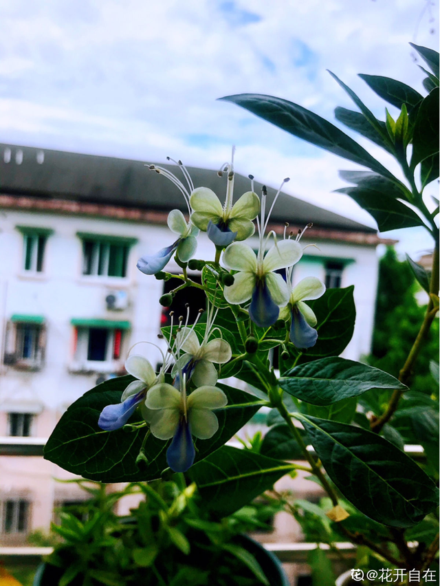 花花今年也養了一盆藍蝴蝶,放在家里的陽臺上。陽臺是凸出來的一塊帶著落地窗的陽臺,能看到周圍鄰居的陽臺。
