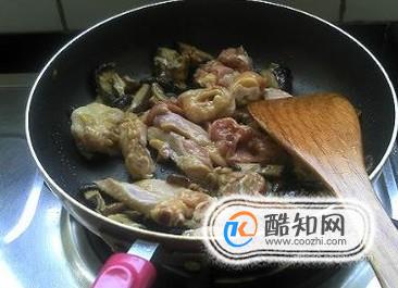 雞肉在鍋中煎炒至其皮變色,然后我們加一點點白酒,老抽,翻炒。