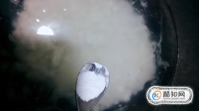 水開后,將準備好的剩米飯倒入水中,再向鍋中加入半勺食用面堿,小火加熱。