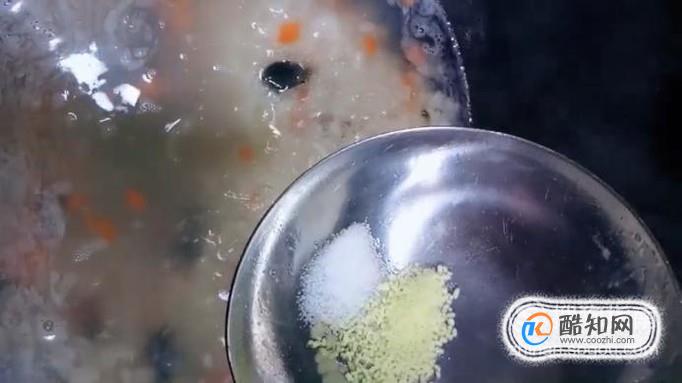 十五分鐘后,向鍋中加入一勺鹽和一勺雞精,加熱攪拌均勻。
