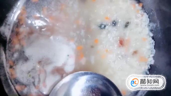 在鍋中放水,水的用量是剩米飯的三倍,將水燒開。