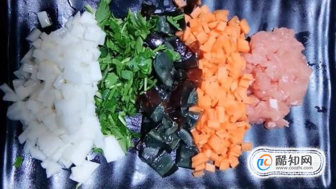 將皮蛋、胡蘿卜、山藥、香菜切成碎末,與豬肉糜一起放在盤中備用。