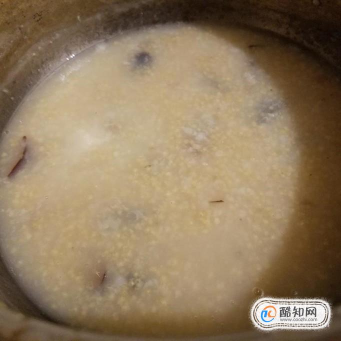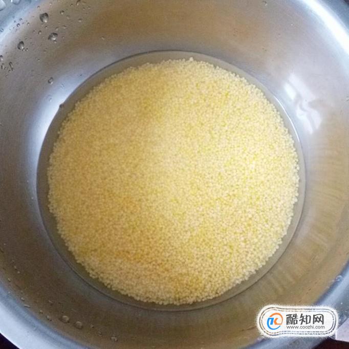 鍋中加水燒開,放入小米,用勺子沿著鍋邊滑動,以免糊鍋。