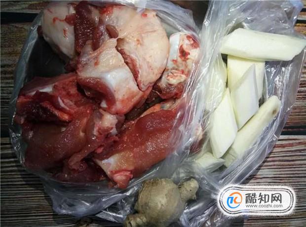 準備好所有材料:筒骨一根、淮山一根、姜適量、蒜頭兩瓣。