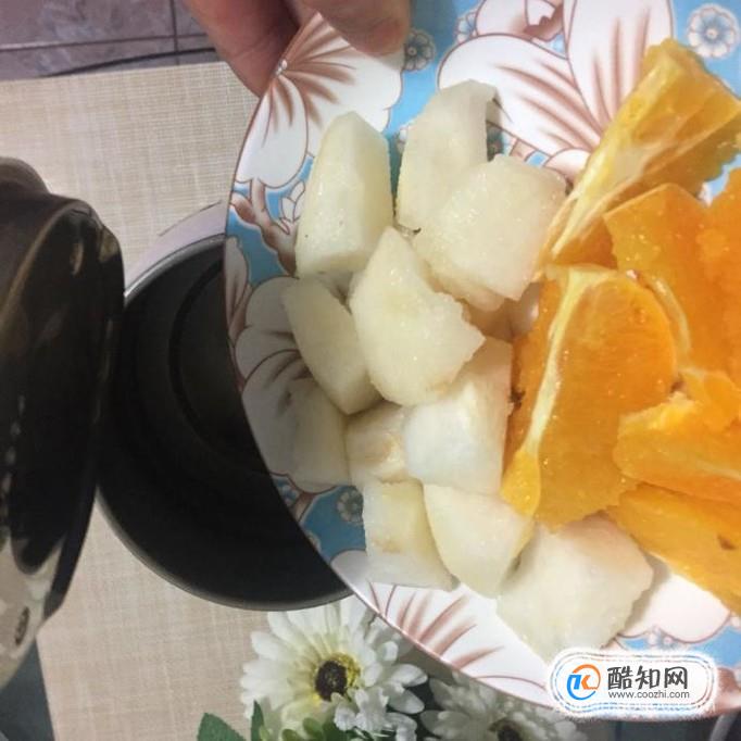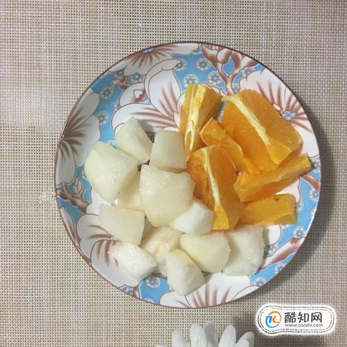 然后將梨去皮切成小塊,橙子去皮切成小塊。