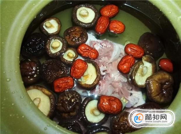 把雞肉、泡軟的蘑菇、紅棗、姜片一起放入鍋中,加入適量的水,大火煮開(kāi)。