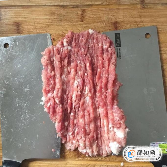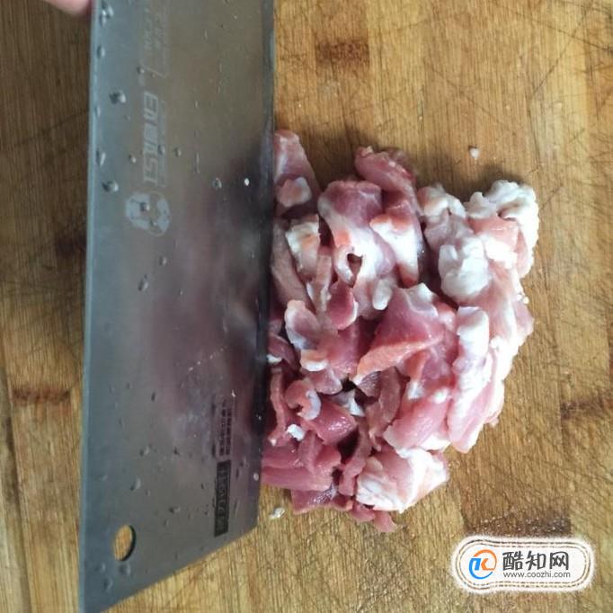 接著把瘦肉切成薄片,然后用兩把刀把瘦肉片剁成瘦肉泥。