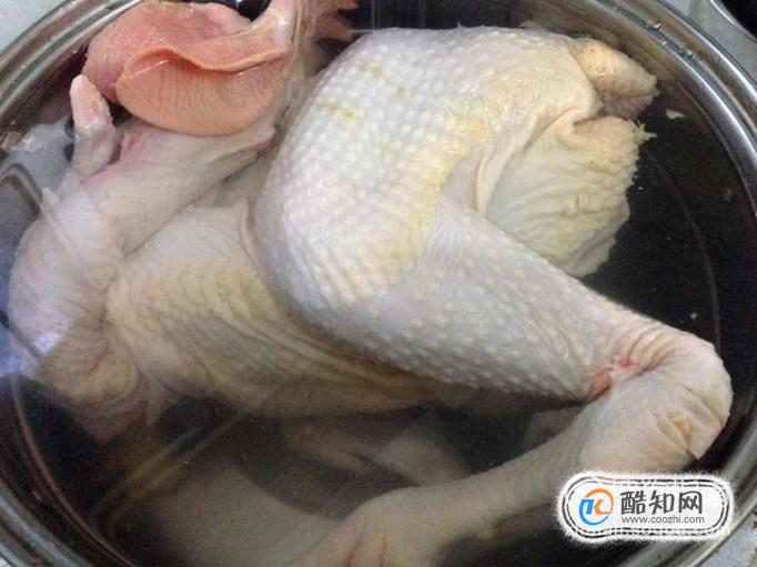 接下來我們需要把老母雞切成塊,燉鮑魚湯的話半個老母雞的量就夠了,我們要把老母雞放入開鍋的水里焯去浮沫、去除血腥味的話可以加入姜片。