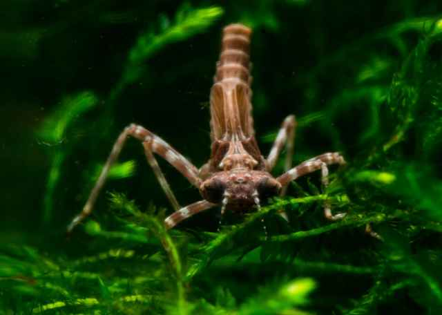 水蠆的獵食: 水蠆即使在完全黑暗的情況下它們也能捕捉到獵物,它們能利用觸角和長腿感覺到水波壓力的變化情況,從而判斷獵物的大小方位,形狀質量等。 蜻蜓成蟲能吃掉比自己小的所有在空中飛行的昆蟲。水蠆在水中也從不挑食,一旦饑餓難耐的時候,所有在它身邊路過的比他小的水生生物也會成為它的美食。 蜻蜓卵孵化時,由于內骨骼脆弱無比,這個時候很容易成為過往魚類的美食。羽化時本能會促使他離開了生活了很久的水里——由體內的荷爾蒙【一種激素】決定的。