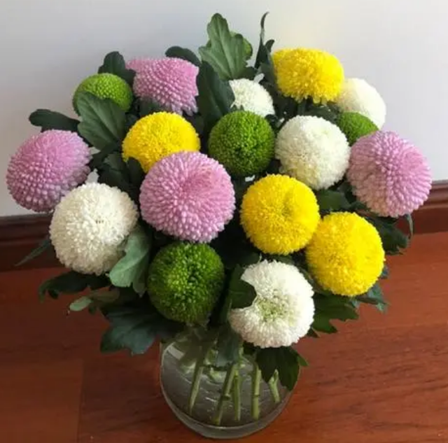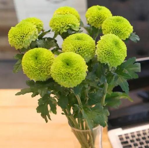 乒乓菊的介紹: 乒乓菊是菊科、菊屬的一種,有黃、綠、白、紅四種顏色,常作為鮮切花使用,原產自日本。 主要生長在我國四季如春的昆明,是園藝種,家庭養殖不多。乒乓菊造型討巧、可愛,而且保鮮時期較長,一般可有20天以上的賞花期深受大眾喜愛。