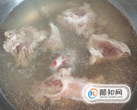 鍋里放下筒子骨和生姜,加水,大火燒開,把骨油熬出來。