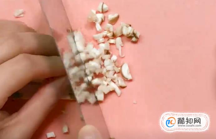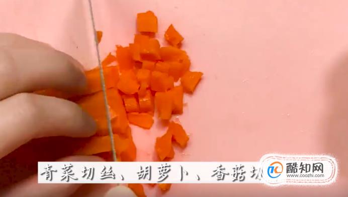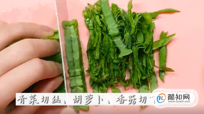 接著,把青菜切絲,再把胡蘿卜和香菇切成丁。