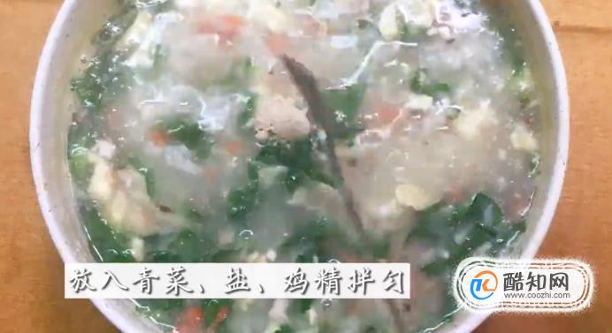 10分鐘后,放入青菜,再加入適量的鹽和雞精,攪拌均勻。
