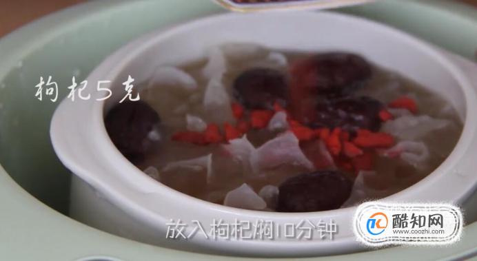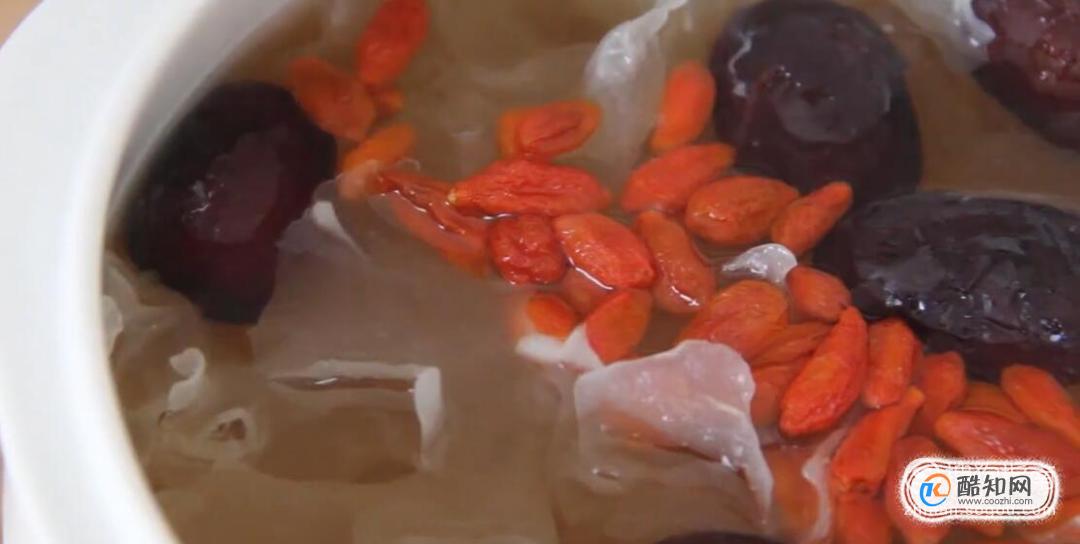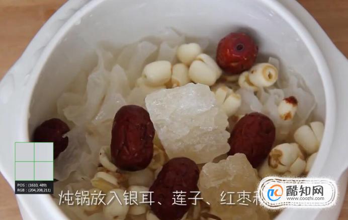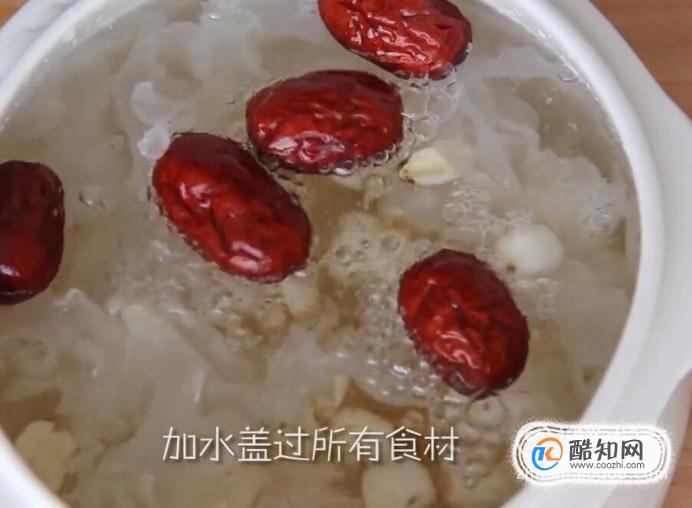 在燉鍋中放入銀耳、蓮子、紅棗和冰糖,加水蓋過所有的食材。