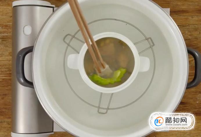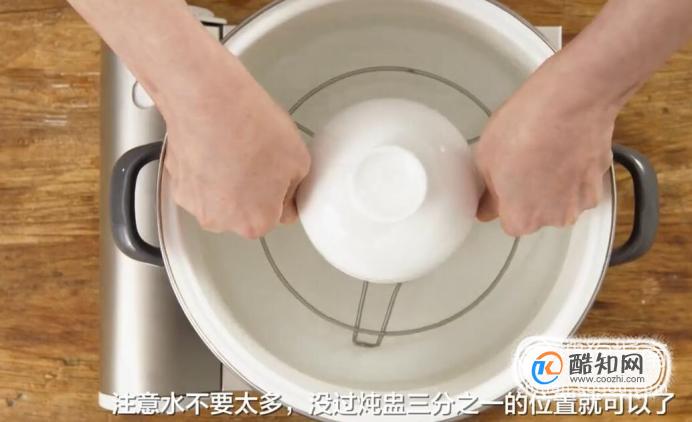 蓋上兩層蓋子,在燉鍋中加入水,放入燉盅。注意水不要放太多,沒過燉盅三分之一的位置就可以了。