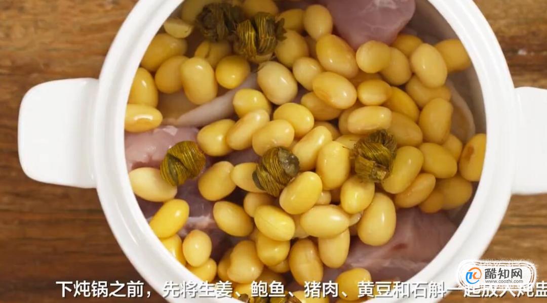 這道湯將就的是清補,所以我們用燉盅隔水的方式來燉。下燉鍋之前,先將生姜、鮑魚、豬肉、黃豆和石斛一起放入燉盅。