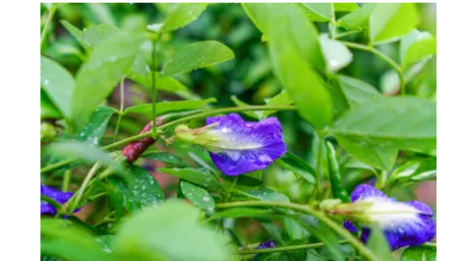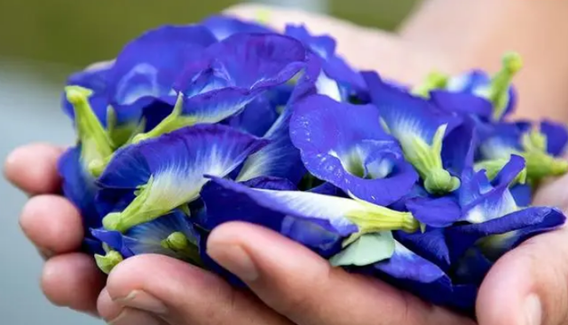 蝶豆花。 藍(lán)色糯米飯是蝶豆花等植物染的。蝶豆花與茜草、板藍(lán)根等都是天然的水溶性植物染色劑。蝶豆花的花瓣可用于染色和食用。具有豐富的維他命A、C和E,富含花青素。