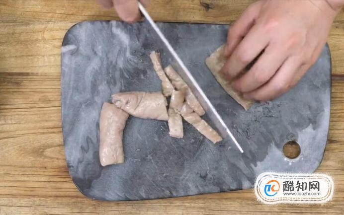 將煮好的肥腸撈出放涼后,腸頭切條,腸身切小塊。