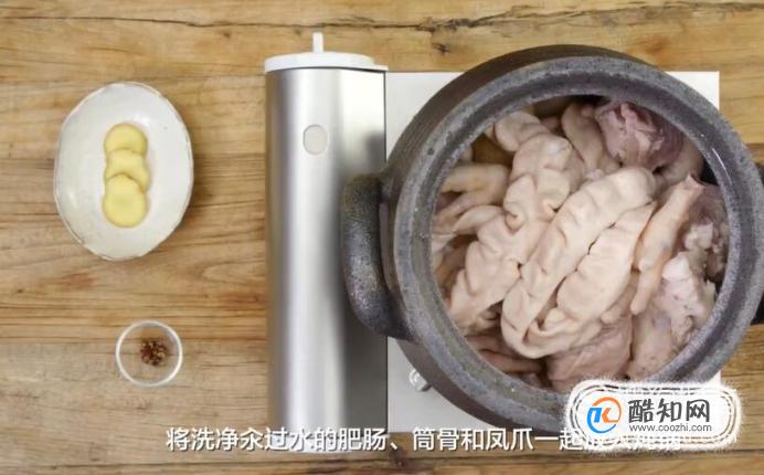 然后處理肥腸。最后選擇帶腸頭的肥腸,將洗凈汆過水的肥腸、筒骨和鳳爪一起放入燉鍋。