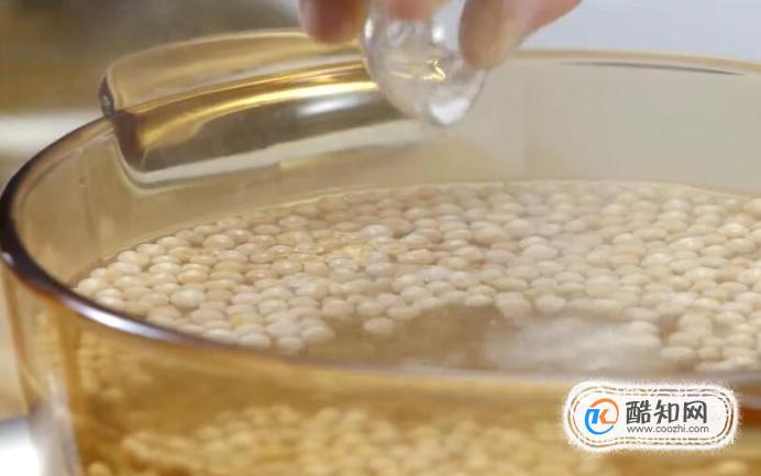 先做豆湯要用的耙豌豆。大火煮沸水,倒入洗凈冷凍過的干豌豆,加入一點食用小蘇打。