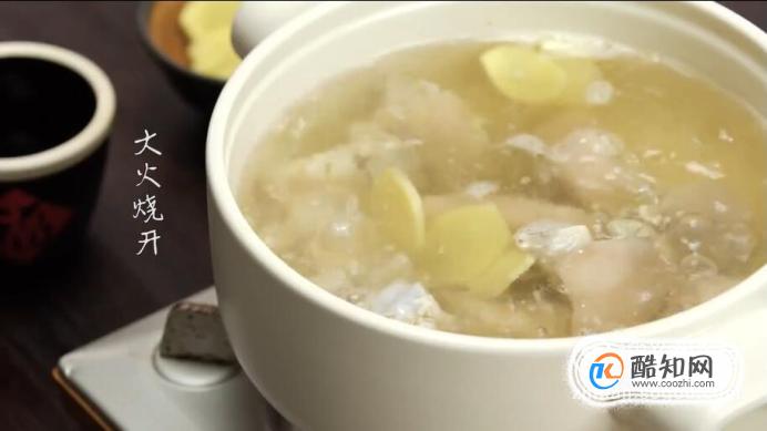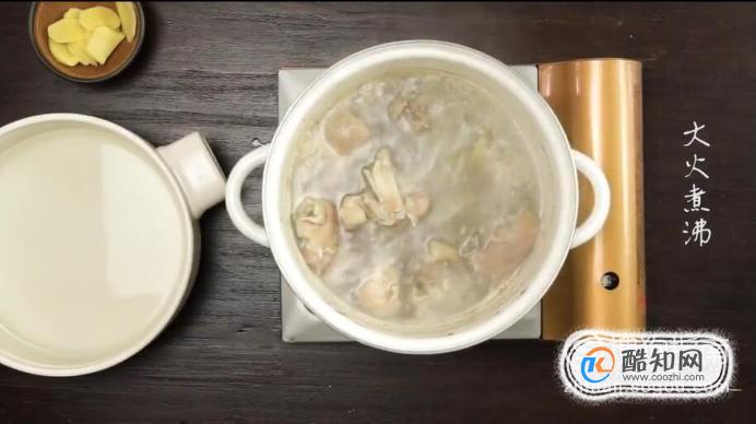 另加一鍋水,放入豬蹄、黃酒、姜片,大火燒開后轉中火燉一小時。
