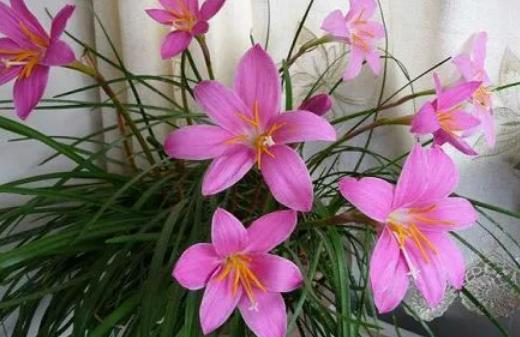 韭蘭簡介 韭蘭,又叫紅玉簾、菖蒲蓮、風雨花、風雨蘭、韭蓮。 它為石蒜科蔥蓮屬多年生草本植物,叢生,植株具地下鱗莖,葉線形,花單生于花莖頂端,下有佛焰苞狀總苞,總苞片常帶淡紫紅色,下部合生成管,花柱細長,柱頭深3裂,蒴果近球形,種子黑色。