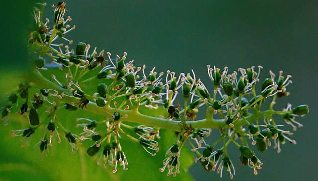 葡萄是會開花的,不過是花朵小而已。 葡萄的花期通常是在五月份前后,花序為穗狀,花蕾初期的大小類似米粒,呈圓錐形。它的花期比較短,通常只有幾天。 一般花序中部的花蕾開放的最早,成熟的最早。然后是基部的,穗尖部分的最后。此外,還要注意花期的病蟲害防治,應在開花前兩三天用藥,做好預防。