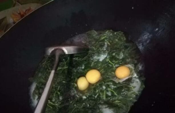 4、水煮開之后,加入兩勺花生油,然后將焯水的艾草倒入鍋中,再往里面打入三個雞蛋,輕輕翻動幾下,最后加入少許的食鹽,攪拌均勻,即可出鍋。