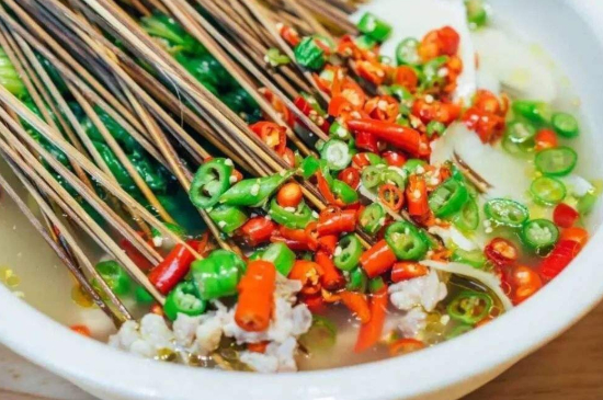 缽缽雞冷串串的調料有紅油、藤椒和清湯三種,其中紅油調料需要把姜片、蔥段、蒜片放入油鍋內炸干,撈出后加入香菜葉、八角炒出香味,再撈出渣滓并加入辣椒面攪勻就可以。而清湯料只需用土雞、香菇、生姜等食材熬好湯汁,再加入白芝麻、青椒和紅椒就可以。 1、紅油缽缽雞調料