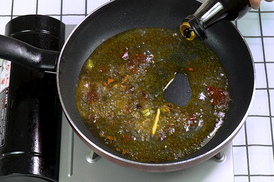 4、放入豆腐燒制入味,等水分快收干后加入蒜苗。