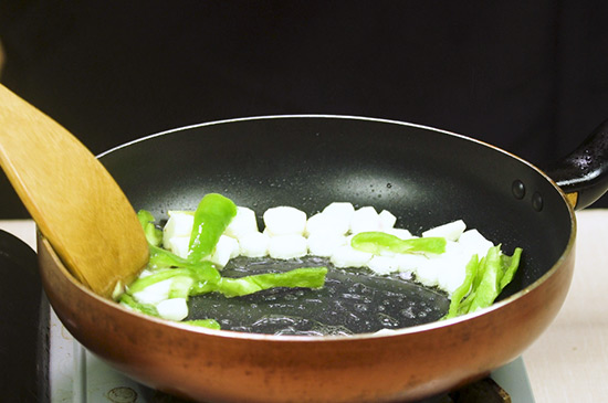 2、在鍋中放入少量油,放入姜絲后炒香,將山藥和辣椒放進入爆炒。