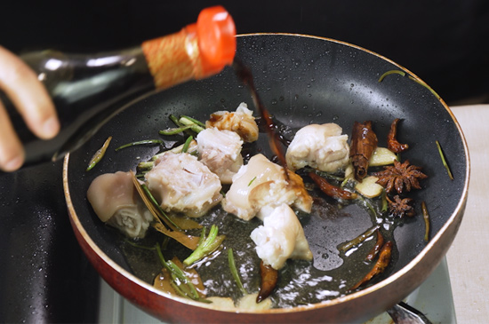 4、倒入豬蹄炒至微黃,依次倒入醬油、料酒、冰糖炒至上色。