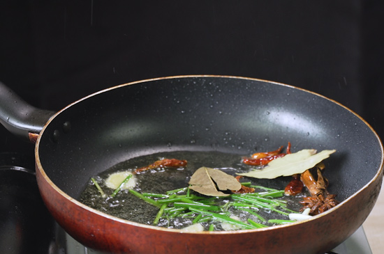 3、往鍋內倒入植物油,油熱后依次倒入姜片、蔥段、八角、桂皮、干紅辣椒、香葉翻炒。