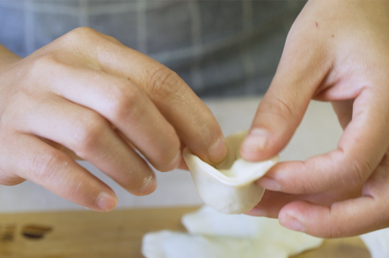 3、將餃子餡放入餃子皮內,根據需要捏成想要的形狀,餃子就包好了。 |