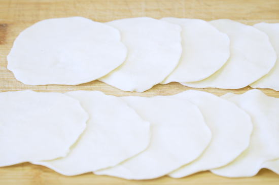 2、將面團搓成長條,切成小塊,再將小塊搟成薄圓形皮子