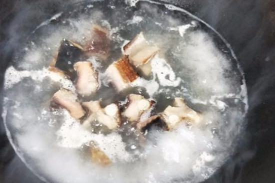 提前將臘魚切成小塊備好,在鍋中倒入干凈的水,開大火將水燒開。把魚塊倒入燒開水中,煮5~10分鐘,撈出瀝干。 步驟2