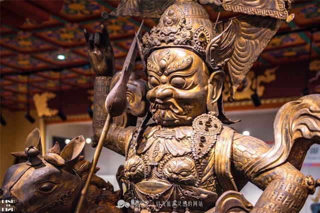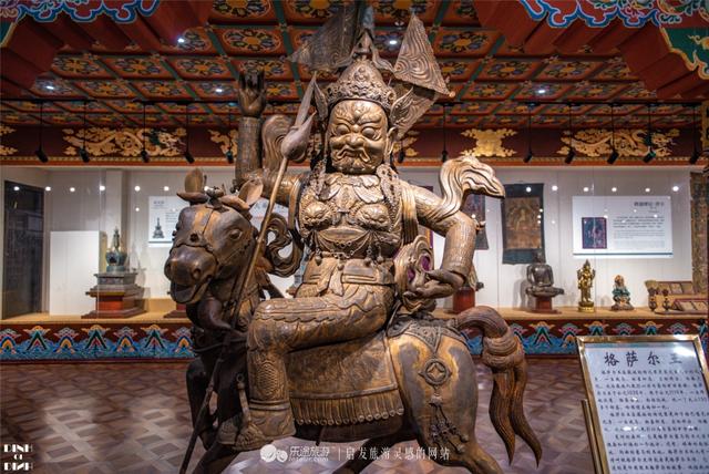 格薩爾王像:藏族人民引以為豪的蓋世英雄 館內(nèi)的展品眾多,首先映入眼簾的就是一尊高2.8米的民國(guó)時(shí)期的格薩爾王青銅雕像。雖說(shuō)是青銅雕像,但是雕像的顏色不再是單純的青銅色,顯示了它的年代感。整個(gè)雕像塑造的是格薩爾王在馬背上馳騁沙場(chǎng)的威武形象,尤其是格薩爾王的面部表情更是不怒自威,讓人心有敬畏。