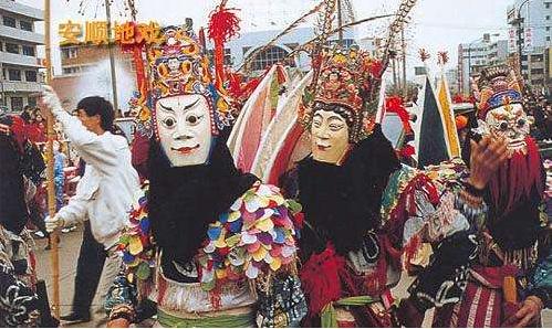 “仡佬毛龍”是石阡仡佬族世代流傳下來的民間崇尚的表現形式,主要流傳于貴州省石阡縣龍井、湯山等鄉鎮的宴明、龍鳳等仡佬族村寨,輻射及于全縣各地的侗、苗、土家各民族。仡佬毛龍主要活躍在元宵節期間,有學者推論,毛龍源起于古代仡佬的“竹王”崇拜和生殖崇拜。 5、安順地戲