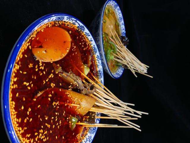 藤椒油調制的拌料晶瑩翠綠,麻而不膩,清香浸人,甚至能香透一條街。將用竹簽串好的菜放進藤椒油湯里一撈,再舉至嘴邊,油艷欲滴,麻辣鮮香。 如果想吃地道的缽缽雞,來重慶找重慶廚老倌,實地品嘗美味的缽缽雞! , |