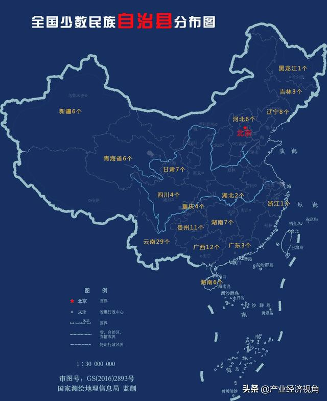 117個少數民族自治縣一覽表 自繪 從數量來看,云南省最多,全省有29個少數民族自治縣,也是分布民族最多的省份,全省有15個民族有自治縣;其次是廣西和貴州,分布有12個和11個少數民族自治縣;其他各省少數民族自治縣均在10個以下,其中浙江和黑龍江僅有1個少數民族自治縣。 從民族分布來看,全國55個少數民族中39個少數民族有自治縣(包括一個縣內有1個以上民族分布),分布最廣的是蒙古族,在7個省份有自治縣,其次是回族和苗族,分別在6個省份有自治縣。