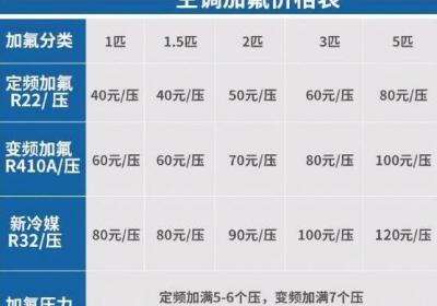 空調(diào)加氟一般需要多少錢,不同收費(fèi)標(biāo)準(zhǔn)價(jià)格參考(1.5匹1次100元),空調(diào)加氟一般需要多少,錢,不同收費(fèi)標(biāo)準(zhǔn)價(jià)格,參考(1.5匹1次1,00元)...